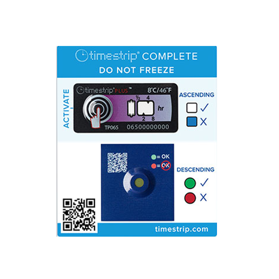- Combinando el indicador de monitoreo de temperatura ascendente Timestrip® PLUS ™ con la tecnología de indicador de temperatura descendente FCP ™, Timestrip® Complete ™ le brinda un verdadero monitoreo de temperatura de 2°C a 8 ° C, de un proveedor con una solución innovadora.
